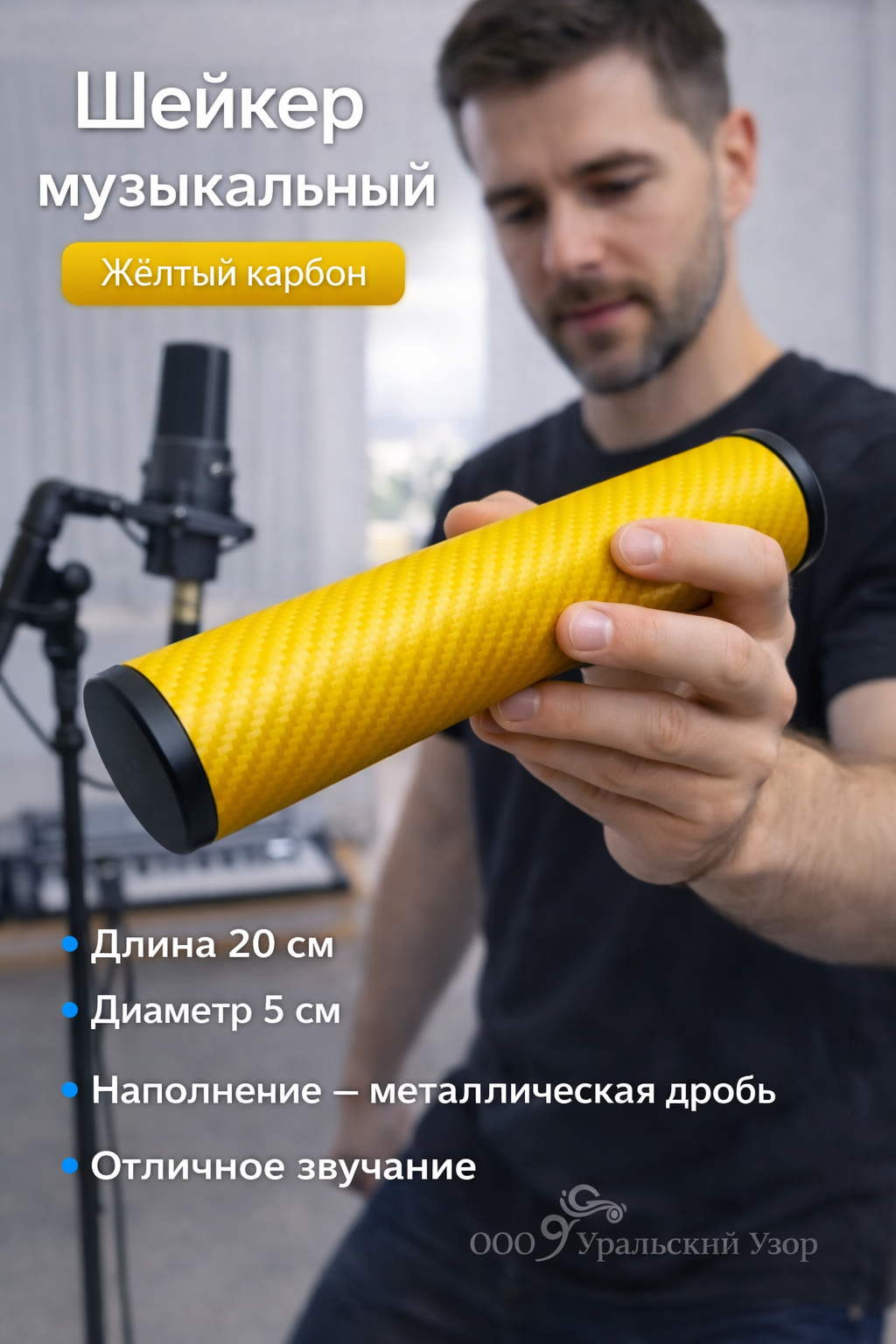 Музыкальный шейкер в цвете жёлтый карбон — это сочетание профессионального звука, надёжности и по-настоящему яркого дизайна. Металлический корпус обеспечивает прочность и стабильное звучание, а покрытие с эффектом карбона в насыщенном жёлтом оттенке делает инструмент максимально заметным.