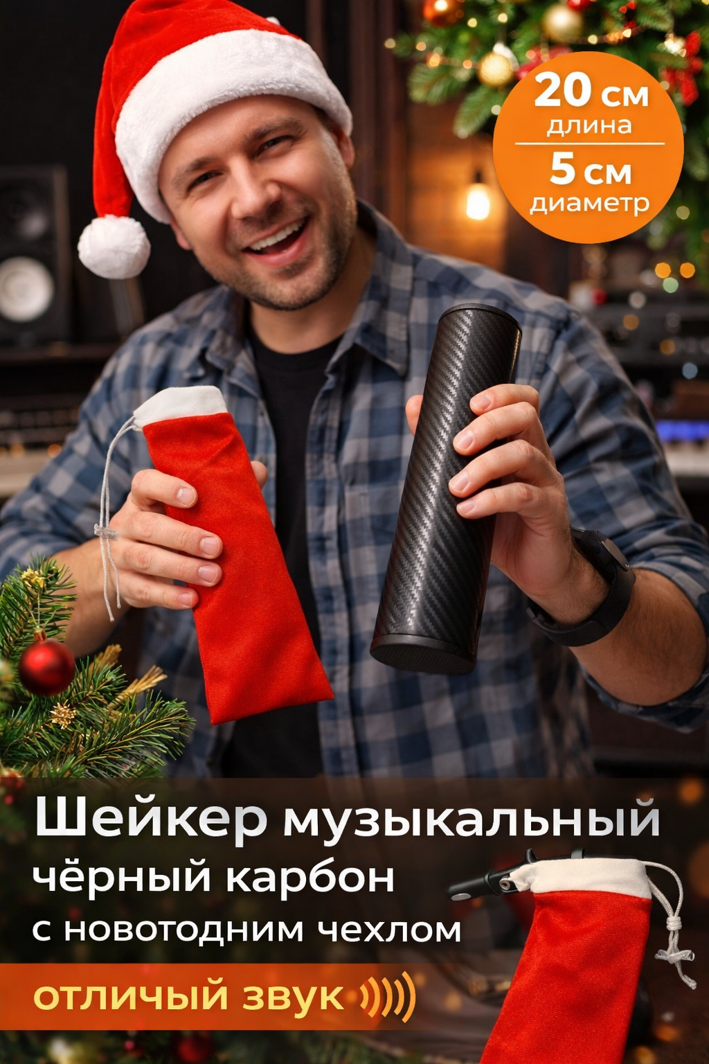 Музыкальный шейкер в цвете чёрный карбон длиной 20 см с новогодним чехлом — это идеальное сочетание профессионального звучания, стильного дизайна и праздничной атмосферы. Прочный металлический корпус обеспечивает долговечность и стабильный звук, а покрытие с эффектом карбона в чёрном цвете придаёт инструменту строгий, современный и универсальный внешний вид.
